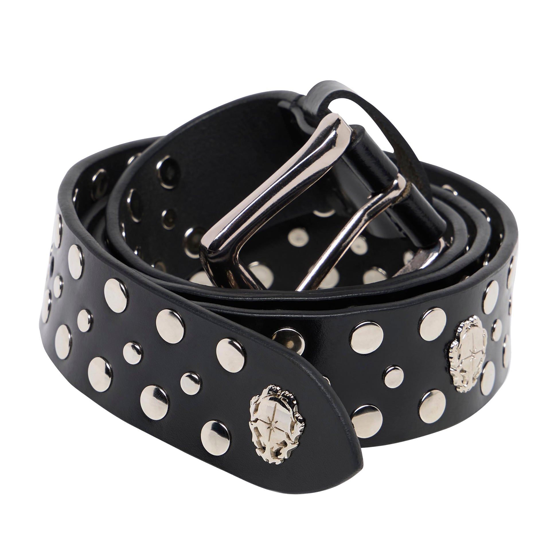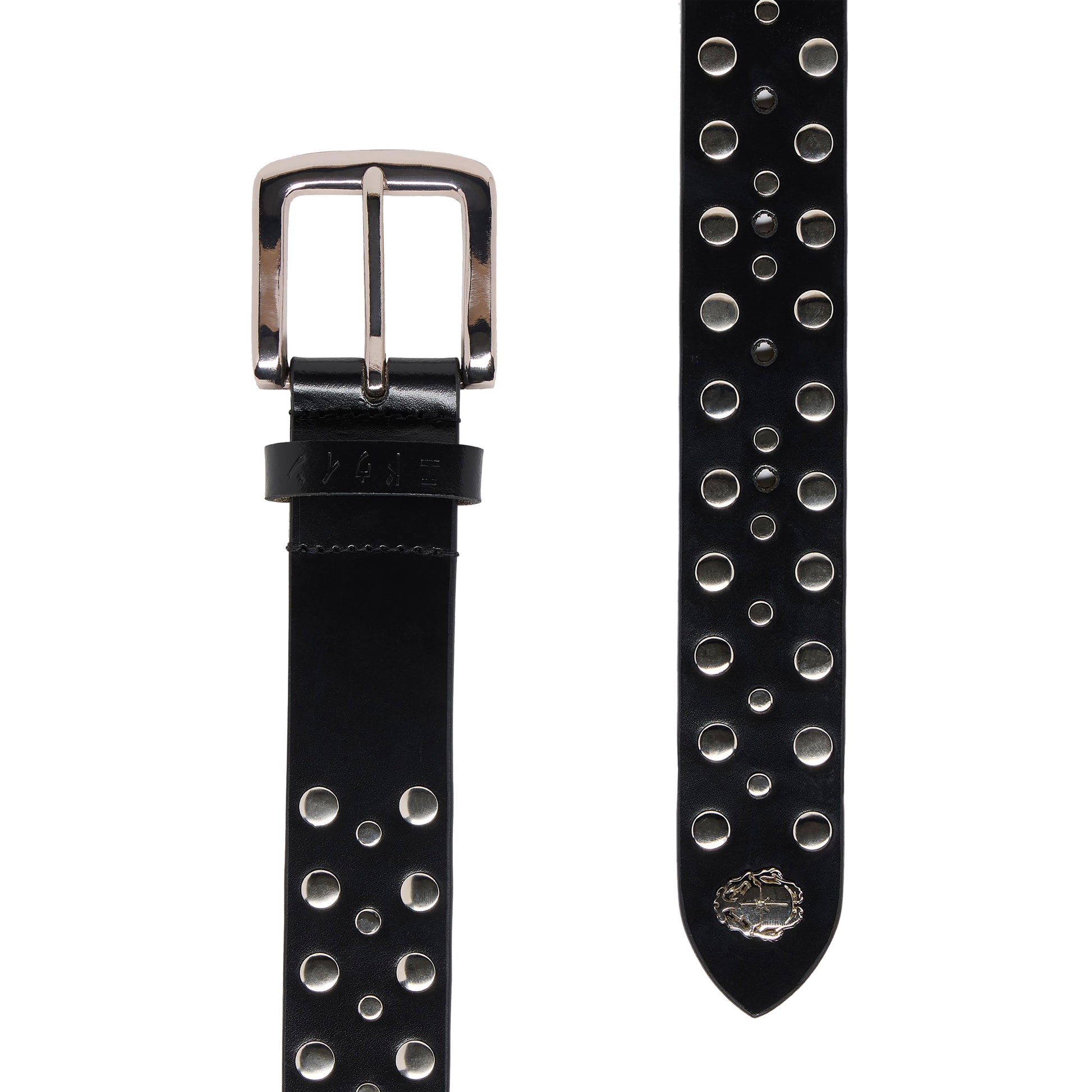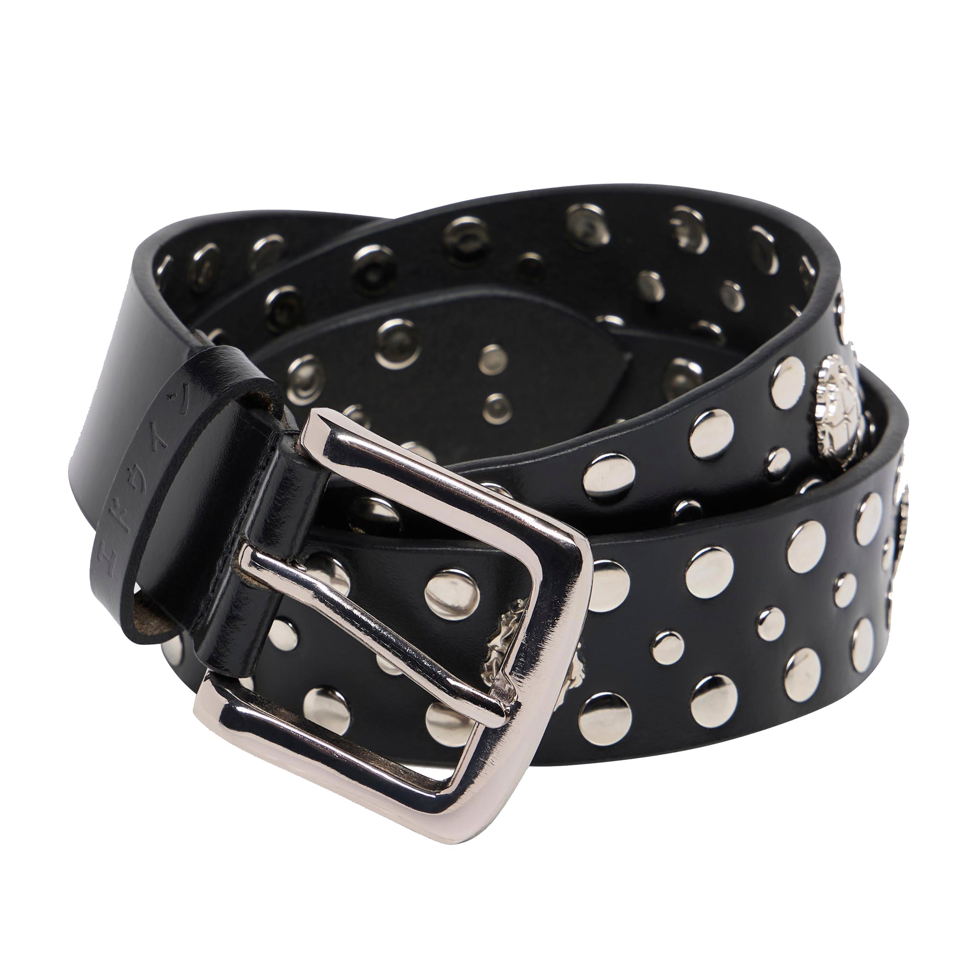 Bælte i bøffellæder med 8 metalnitter formet som biller, rustfri ståls spænde og EDWIN Beetle-logo på løkken. 3,5 cm bredt.