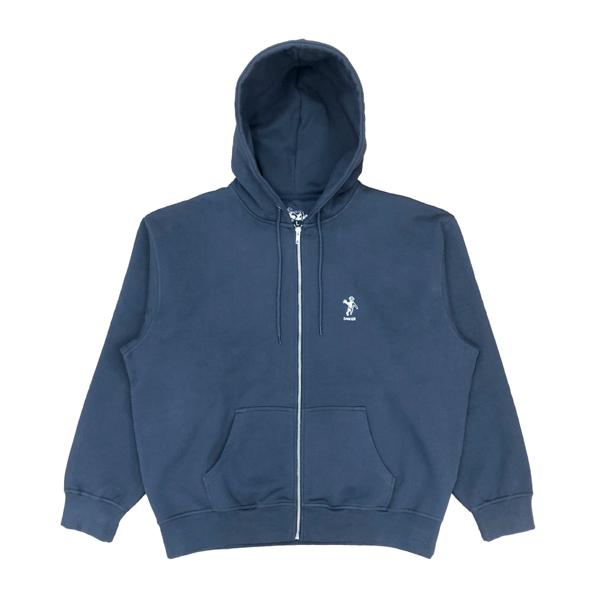En hættetrøje med lynlåslukning og kængurulomme. Den har et grafisk broderi foran på ventre bryst samt justerbar snøre i hætten.