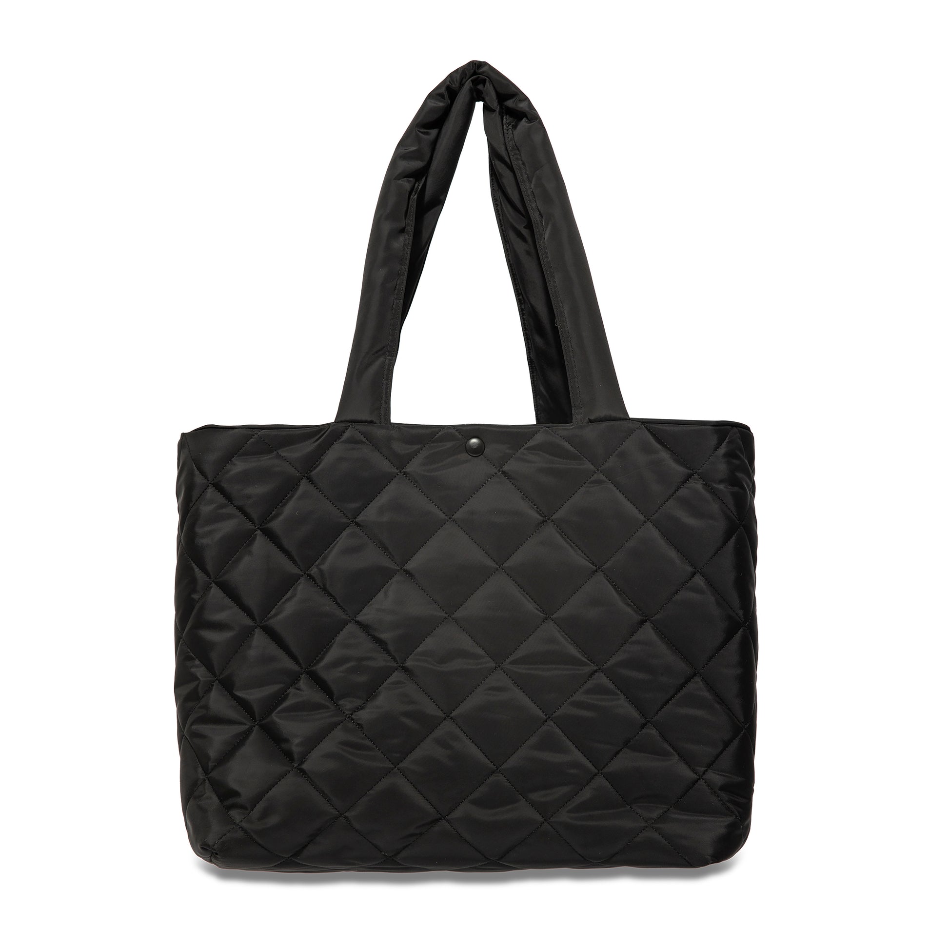 En rummelig tote bag i quiltet nylon. Tasken har trykknap og broderi foran.