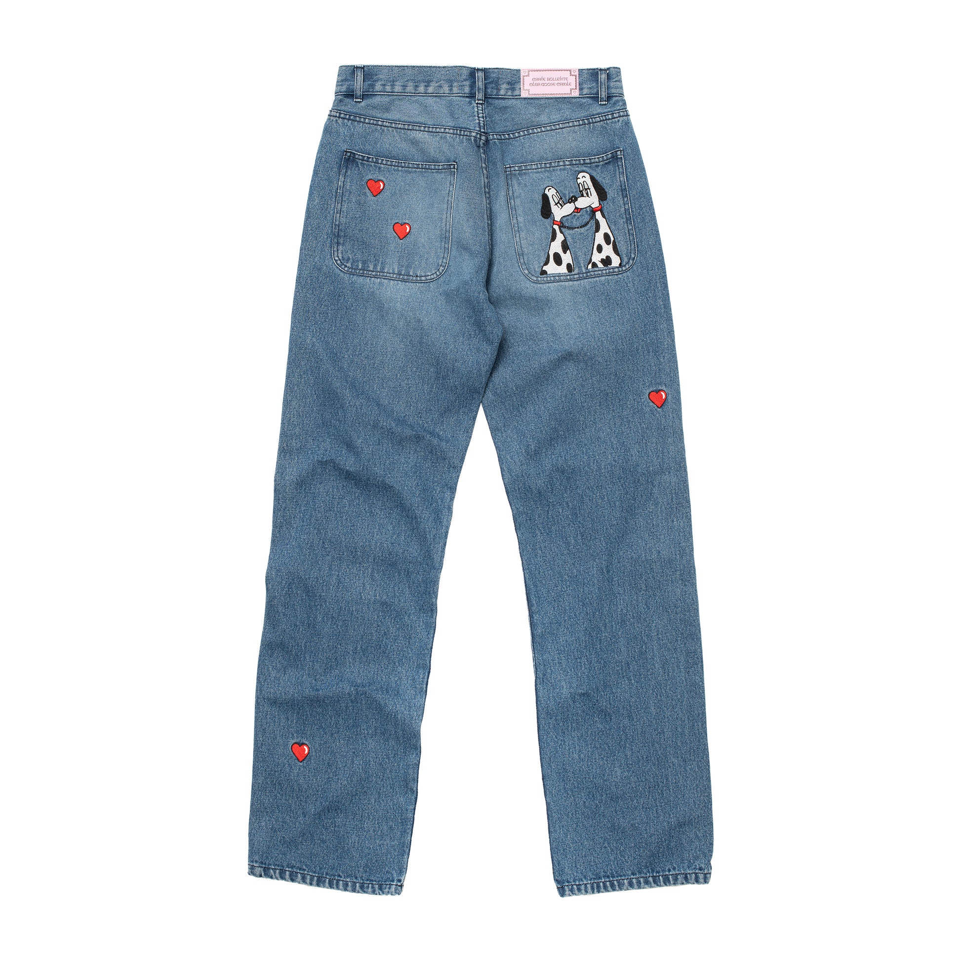 Denim & Dalmatians er et par bukser i denim fra Carne Bollente. Bukserne har patch-detaljer foran og bagpå. Unisex.