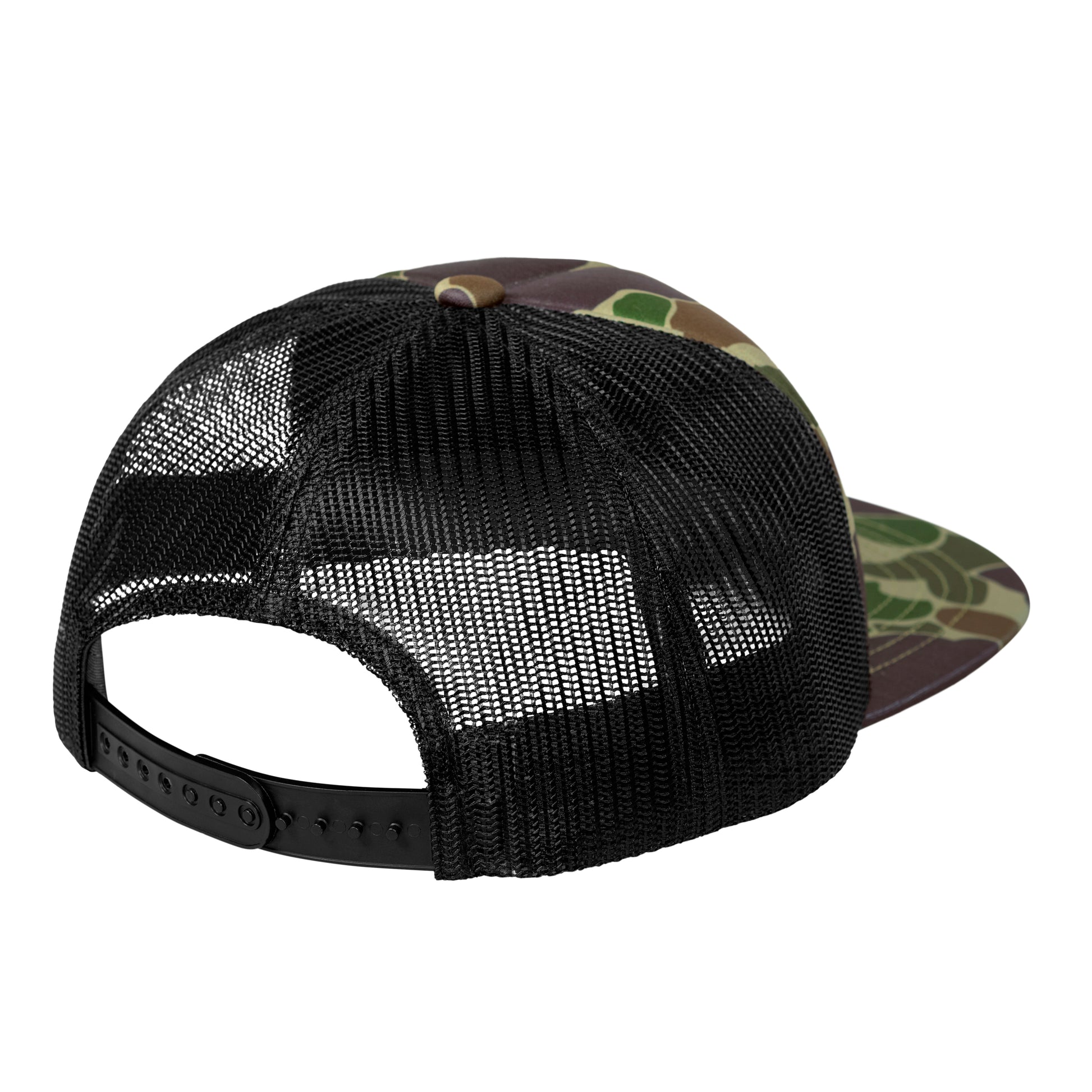 Flying Ducks Trucker Cap er en struktureret 5-panel lavet af polyester skum med et camouflageprint over hele hatten. Den har også en fast, flad skygge. En snapback lukning giver en justerbar pasform.