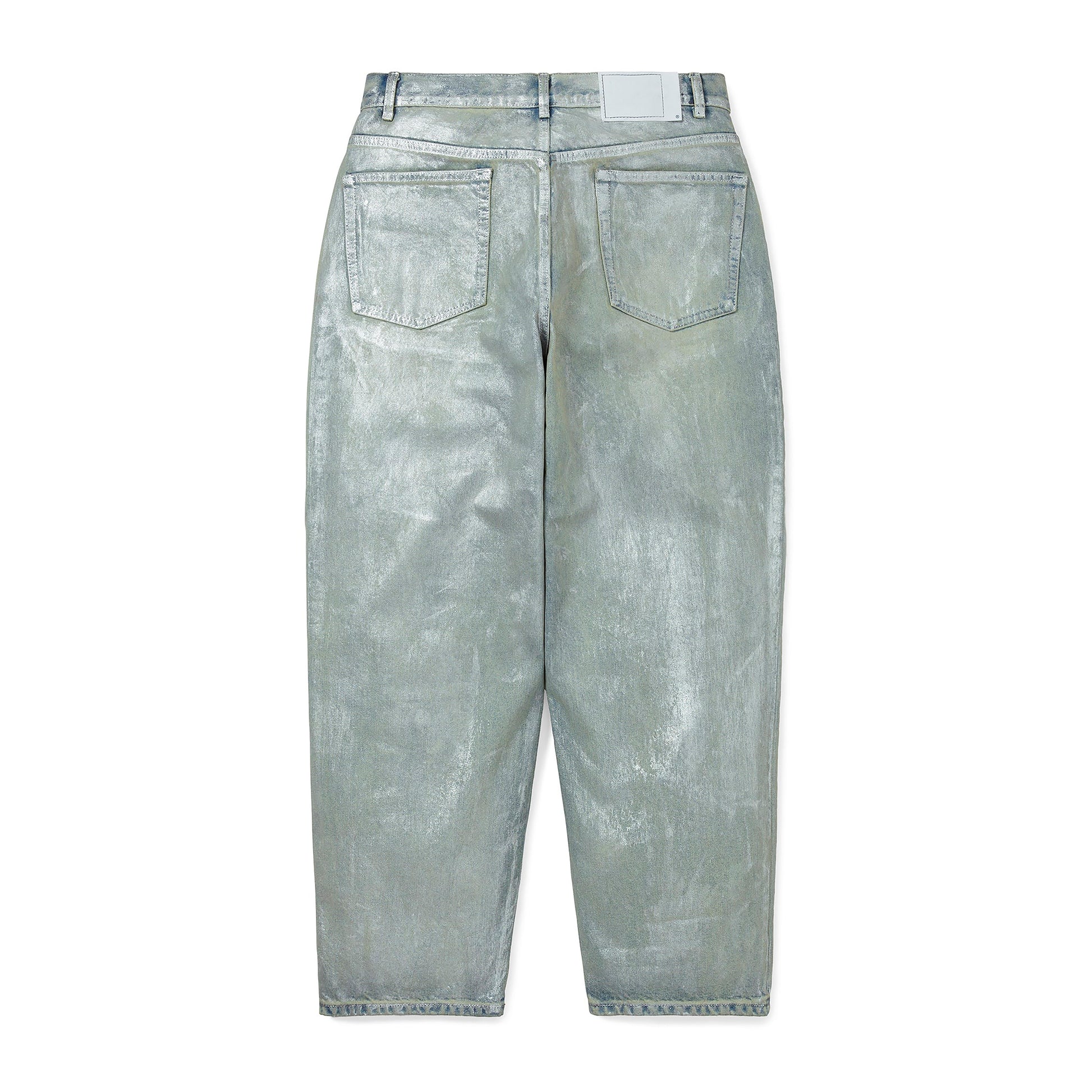 Jeans i 13oz denim med et afslappet fit og en unik metallisk spray-effekt, der giver et moderne, reflekterende udtryk. Stoffet er stone-washed for en blødere fornemmelse og naturlig struktur. Designet med klassisk 5-pocket konstruktion, YKK metallynlås og branded knaplukning, forstærket med metalnitter og afsluttet med et papirmærke i taljen bagpå.