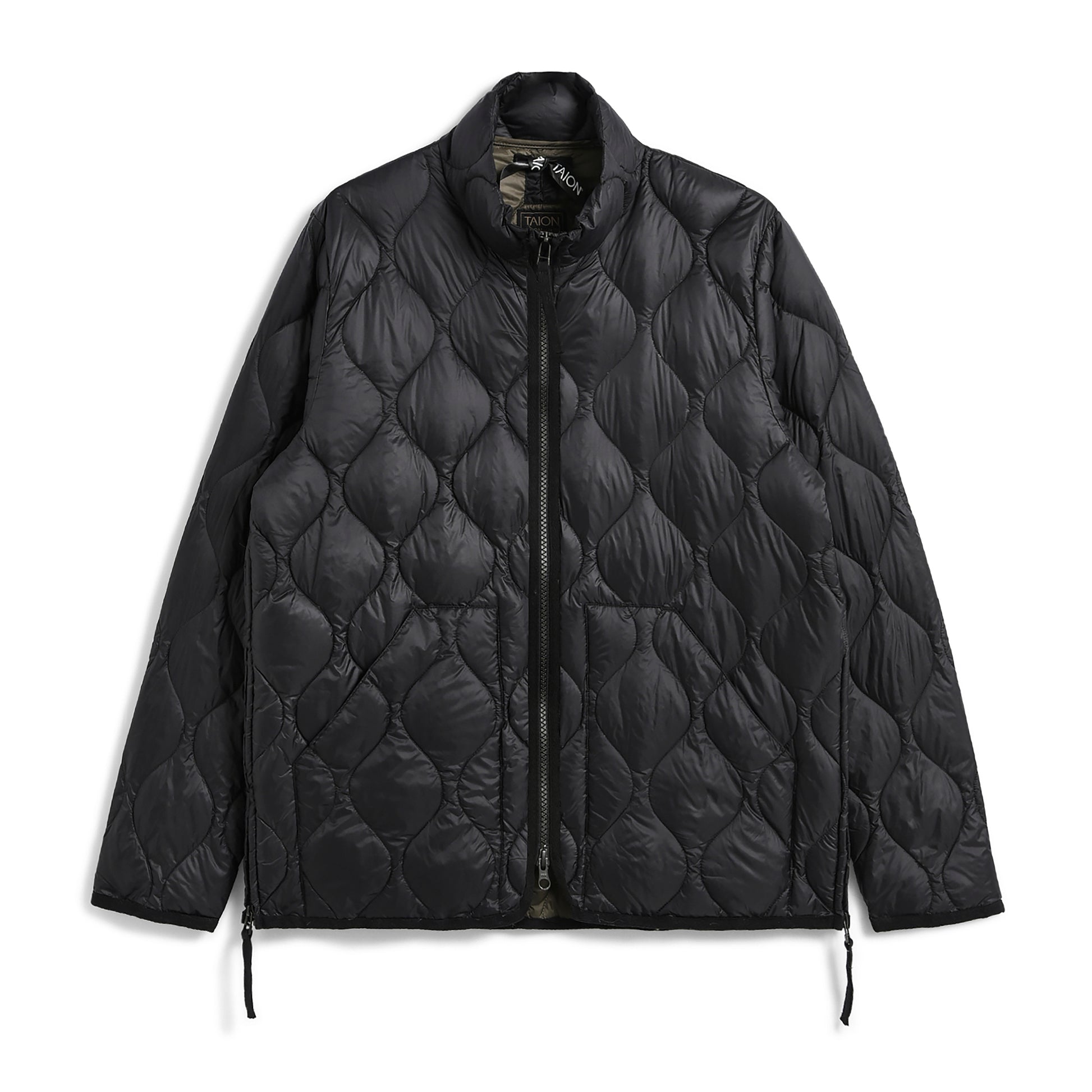 Military Hi Neck W-Zip Down Jacket er en quiltet liner fra TAION. Lineren har en høj hals, gennemgående lynlås, to rummelige lommer, samt sideslidser med lynlås. Det er en soft shell jakke med let dun / polyester foer i onion mønster med tone-i-tone kantebånd og lynlåse.