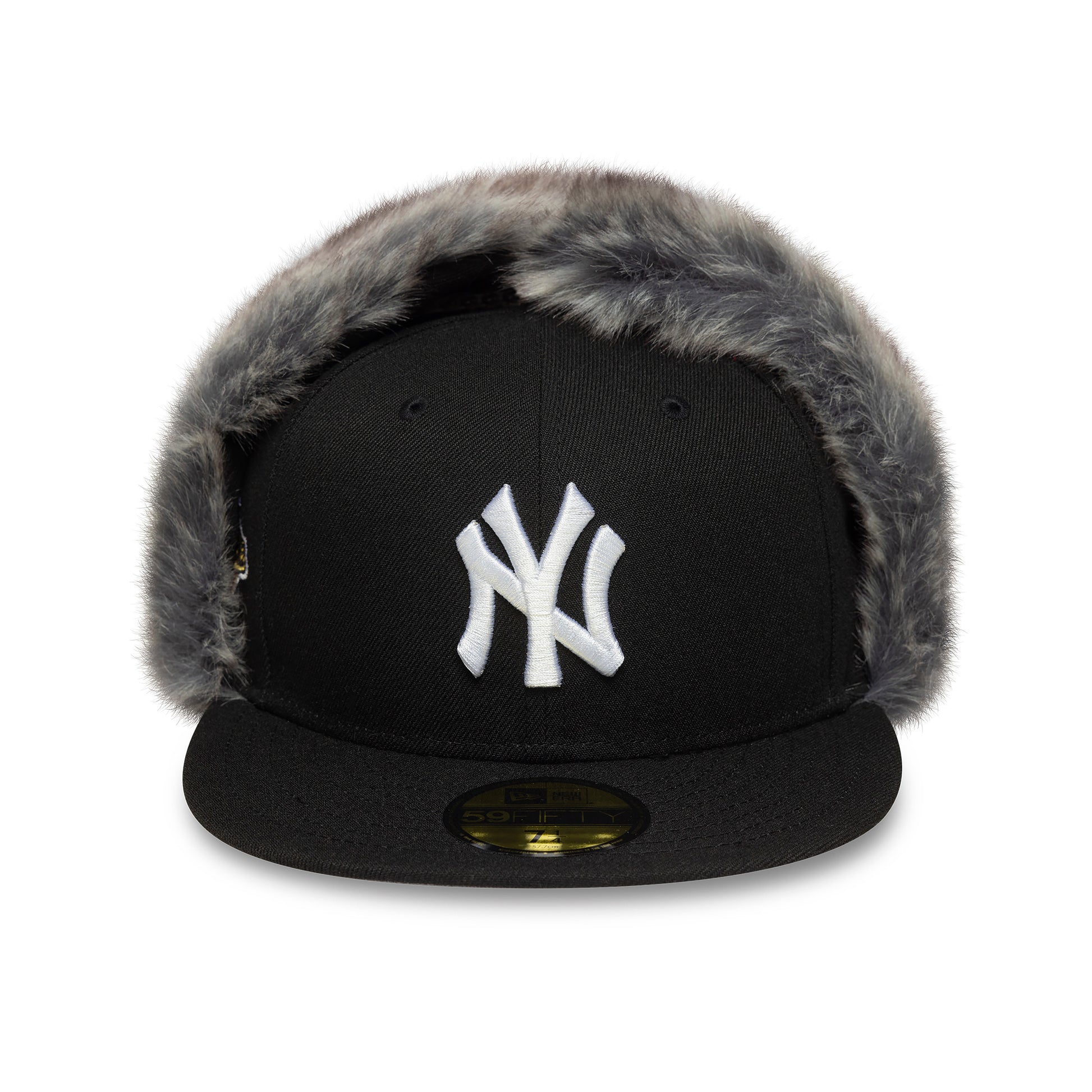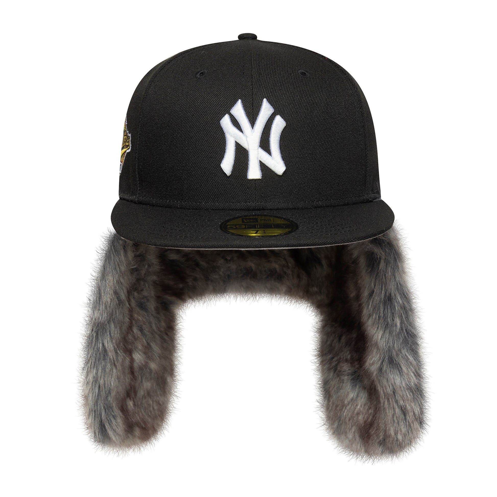 Varm og funktionel fitted kasket fra New Era med faux fur-forede øreklapper, som kan knappes op eller ned. Kasketten har broderet Yankees-logo på fronten, New Era-flag på siden, World Series-logo på højre side og MLB-logo bagpå.