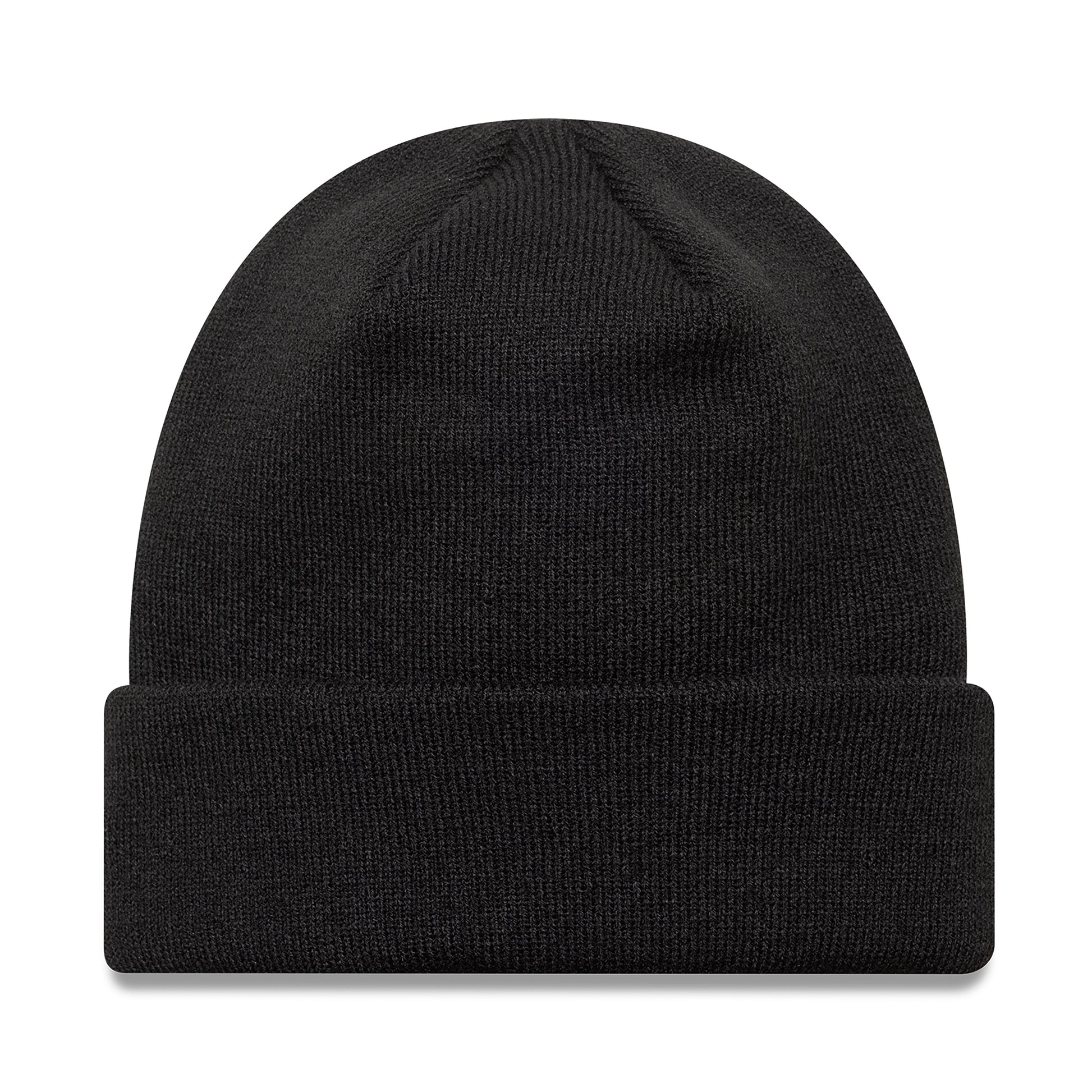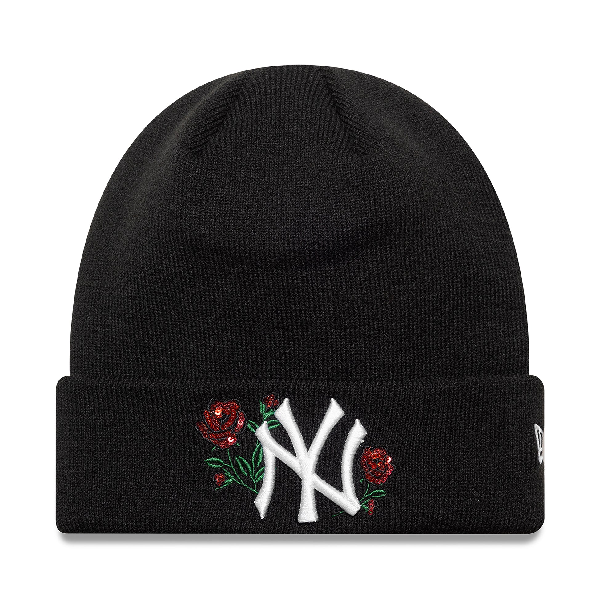 En sort strikket beanie med bred opfoldet kant og Yankees-logo dekoreret med broderede paillet-roser på fronten. New Era-flaget er broderet på siden som et signaturdetalje.